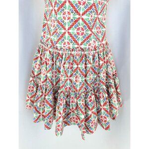 Beautiful red, blue, yellow, and green pattern over white background. Three elegant front buttons. Side zipper closure. Lined.