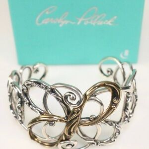 233 BRAND NEW IN THE CAROLYN POLLACK BOX READY TO GIFT! CP Cr Logo 925 Brass hallmarks. Looks like a 2 tone butterfly or CP initials in a fabulous large thick solid cuff in etched scroll patterns. Measures approx. 6.25 circumference including opening. 2.5" across. 1.5" high. Weighs 21.6 grams.