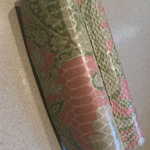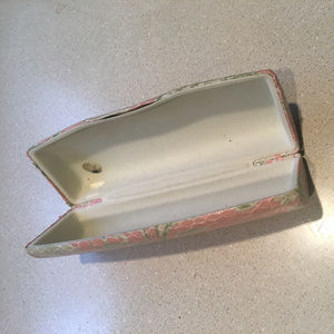 A pale pink and green eyeglasses case. The case has a hinge type closure and is lined in a soft suede-like material. Indention in center is for easy opening. Pretty faux snake print. Size- 2 1/4" wide, 6 1/4" long