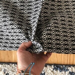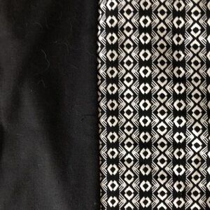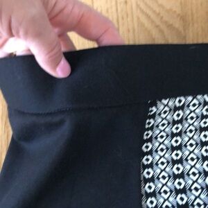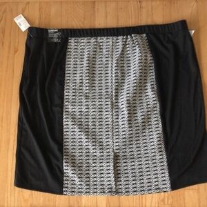 Beautiful pencil skirt. The Black and White design runs both the front and back with Black panels on both sides. Elastic Comfort Waistband. Side zipper and hook closure. Slight Hi-Low design. Smoke free home. I am happy to help with any questions you have.
