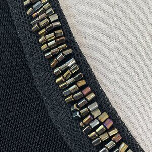 A classic black tank top designed for plus-size women, featuring a decorative metallic trimmed neckline.