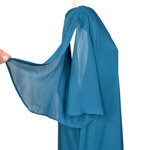 Soft asymmetrical tiers of elegant chiffon give this maxi a little extra drama and excitement. Scoop neckline has a flirty keyhole with rhinestone trim. Soft sheer sleeves echo the fluttery beauty of the tiered skirt.