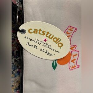 Brand new with tags and never used. This Catstudio “Eat a Peach” woven zip pouch celebrates the Peach State with vibrant original artwork showcasing Georgia’s most iconic landmarks and towns, including Atlanta, Athens, Savannah, Okefenokee, Tybee Island, and more. Beautifully woven (not printed) with luxe poly fabric that resists dirt and stains, it features a secure zipper with a signature pull and black lining. Compact at 5x7 inches, it’s perfect for cosmetics, cards, tech accessories, or travel essentials. A collectible keepsake that’s both functional and stylish for Georgia lovers, travelers, or Bulldog fans.