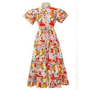 Tags: Floral midi dress, colorful boho dress, embroidered trim dress, statement sleeve dress, puff sleeve dress, button front dress, Anthropologie style dress, Farm Rio inspired dress, festival dress, spring summer dress, vacation outfit, ruffle sleeve dress, fit and flare dress, bold print dress, eclectic fashion, unique party dress, tropical floral dress, feminine bohemian chic, vibrant multicolor dress, scalloped trim dress, retro floral pattern dress.