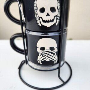 NEW Ceramic Skeleton Espresso Mugs Mug Set of 4 Stacking Stackable Black Stoneware