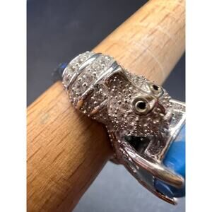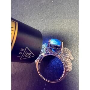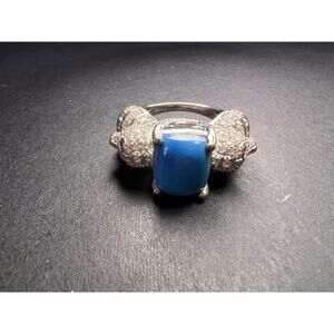Genuine blue and natural ceruleite stone prong set in an authentic 925 sterling silver unique seahorse design. Plated with rhodium and encrusted with white zircon accent stones and black spinel stones in the seahorse’s eyes. Ring has a total ctw of 5.50 and weighs 10.31 grams. Measures a size 8. Truly unique! Djoy. Made in India. Estimated retail value is $550.