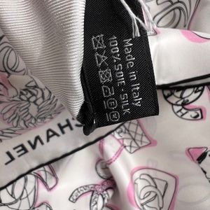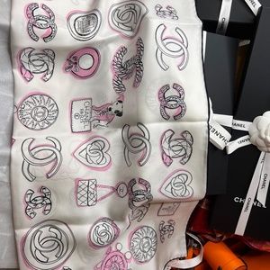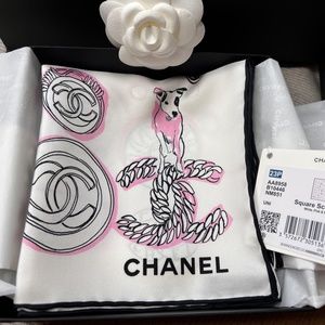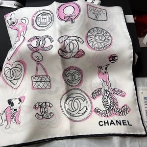 NEW Chanel 23P Puppy Dog CC Heart Charm Square Silk Scarf Pink White Beige