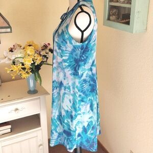 NEW The pretty blues in this dress will lighten any mood! Keyhole ties in front and keyhole with button on back. Semi sheer over full lining. Pull over. Size 4 measures 38 at chest, 38 at waist, 42 at hips, 36 long from shoulder to hem. Soft and swirly and NEW.