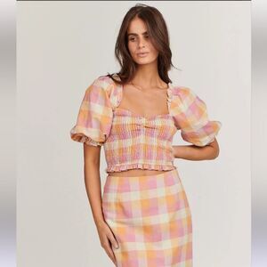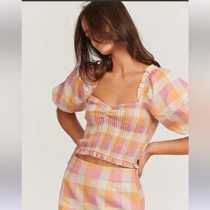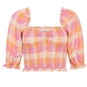 This Charlie Holiday Pink Multi Check Andrea Smocked Puff Sleeve Crop Blouse has never been worn and in excellent condition.