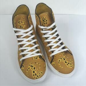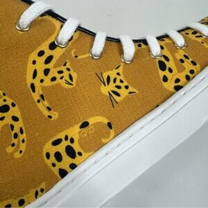 NEW Charlotte Olympia Yellow Feline Print Lace Up Canvas High Top Sneakers 36.5