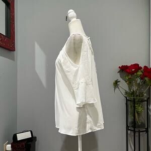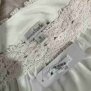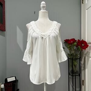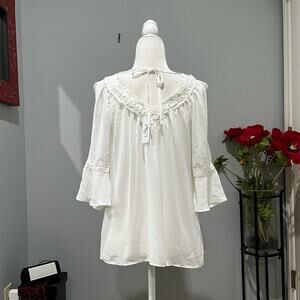 New with tags Gorgeous Romantic Longline Flutter Ruffle Cold Shoulder V-Neck Flowy Poet Tunic Top with Self Tie Neck, 3/4 Bell Sleeves, and Floral Crotchet Embellished Decorative Contrast Neckline by Charming Charlie. Oversized. Lightweight and Comfortable. White. Women’s Size Small.