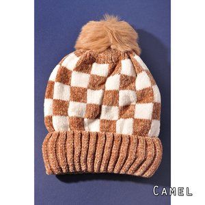 NEW Checkerboard Checked Super Soft Velour Cozy Fleece Lined Pom Pom Beanies Hat