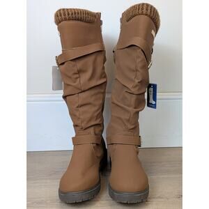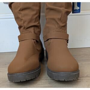 NEW Cherokee Womens Tall Boots 8 Brown Slouchy Knit Cuff Zip Buckle Lug Sole