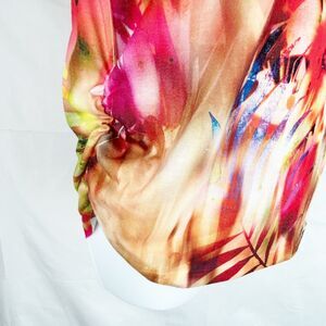 Here is a vibrant, colorful floral knit top by Chico's, womens size M (8) Chico's size 1. It's got a scoop round neck, short sleeves, rouching at the sides and colorful studded bling on the front! New, without tag.