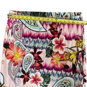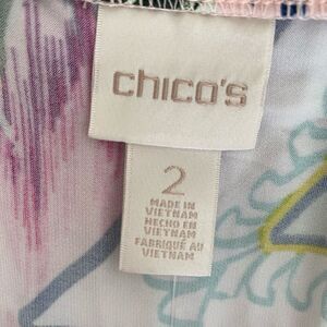 Get ready for a tropical vacation with this new Chico's Ikat maxi skirt! The colorful multicolor pattern and high-rise style make it perfect for a resort or Hawaiian theme. The elastic waist closure and pull-on design provide comfort and convenience for a casual occasion. Made of machine-washable polyester, this skirt is easy to care for. The skirt is brand new, with tags attached, and is a Chico's size 2 US 10/12 large. Don't miss out on this must-have addition to your vacation wardrobe!