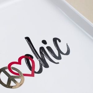 The symbol for peace and love are stamped on the tray alongside chic, for a fun fashion statement