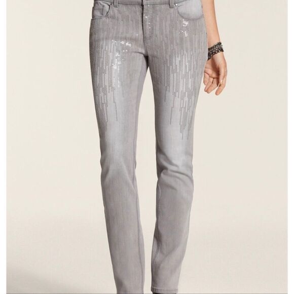 NEW Chico’s Sequin Frost Slim Jeans Gray Silver 00 US 2