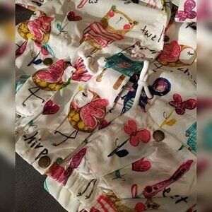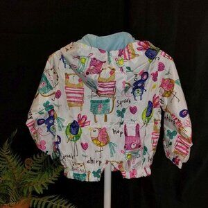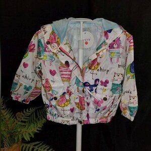 Cute windbreaker jacket! Jacket is lined has a zipper and snap closure, pockets and hood. This is a lightweight jacket.
