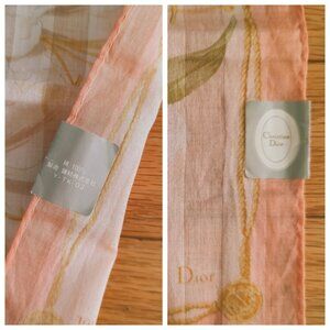 New with tag gorgeous vintage Christian Dior small scarf / neckerchief. Has a delicate striped pattern behind floral bursts. Great all-season piece! Tie at your neck or pair with your favorite neutral bag as a bag scarf! 19"x18"