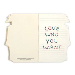 The Love Who You Want Die-Cut Notebook is Inspired by a game created by the French surrealists in the 1920s, where various artists imagined the continuation of a painting not knowing what had been painted previously, the Love Who You Want journal is an iconic Lacroix design.