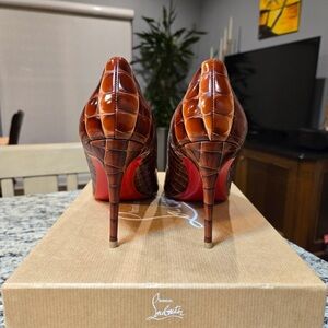 These Christian Louboutin heels feature a striking crocodile like pattern in rich cognac tones, crafted from glossy patent leather for a sophisticated look. The tall, slender heel and classic pointed toe design make them a standout choice for any fashion-forward occasion.