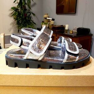 NEW and Authentic Christian Louboutin Lock Cool Croc-Embossed Leather Sandal in silver croc-embossed leather and silver-tone hardware with lock logo accent