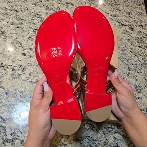 Experience the luxury of Christian Louboutin with these tan T-strap croc embossed leather sandals, crafted from premium leather for a polished look. The sandals feature thin, elegant straps adorned with metallic embellishments, offering a touch of sophistication. Perfect for summer outings, these sandals provide both style and comfort with their flat red sole design.