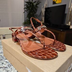 NEW Christian Louboutin MJ Thong 25 Tan T-Strap Croc Leather Sandals