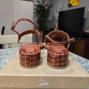 These Christian Louboutin sandals feature a sophisticated T-strap design in a luxurious tan leather with striking red soles. The textured croc embossed leather adds a touch of elegance, while the adjustable metallic buckle ensures a perfect fit. Ideal for adding a stylish flair to any outfit.