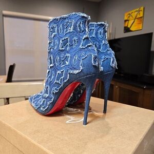 These striking Christian Louboutin ankle booties feature a vibrant blue denim upper adorned with bold CL logos, complemented by a contrasting red stiletto heel. The sleek silhouette and slightly slouchy fit around the ankle make them a standout choice for any fashion-forward ensemble.