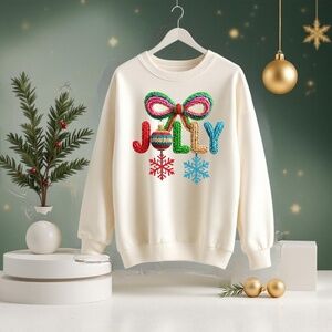 We are absolutely swooning over this "Faux Yarn" aesthetic! This Sweatshirt brings that warm, handmade feel to your holiday gear. It features the word "JOLLY" designed with a hyper-realistic crochet texture in bright red, green, blue, and tan.