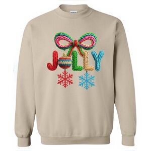 We are absolutely swooning over this "Faux Yarn" aesthetic! This Sweatshirt brings that warm, handmade feel to your holiday gear. It features the word "JOLLY" designed with a hyper-realistic crochet texture in bright red, green, blue, and tan.