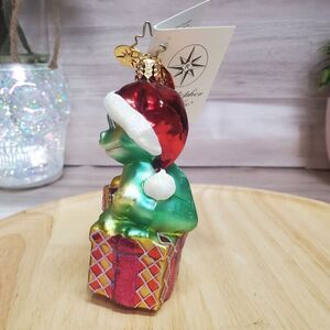 The featured frog design is perfect for those who love unique and eye-catching ornaments. The piece comes in its original box, making it a great gift option for any collector. The Radko Christmas Ornament is a timeless piece that will bring joy to any Christmas tree.