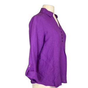 New With Tags! Vibrant purple color v-neck with collar. Sleeves can stay down or can roll and secure with button. Faux buttons in front.