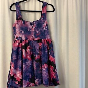 Elegant midi dress with vibrant floral pattern. Features a mix of pink and purple hues. Perfect for any occasion.