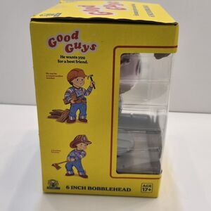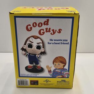 This product is a Culturefly exclusive Child's Play bobblehead featuring Chucky, the iconic character from the horror franchise. The 6.25" polyresin figure is brand new in its original packaging and the box was only opened to take better pictures of the creepy character. It is a great addition to any horror collection and a must-have for fans of the Child's Play series. The bobblehead is a Good Guys version and is suitable for ages 17 and up. It was manufactured in China and is part of the Child's Play product line.