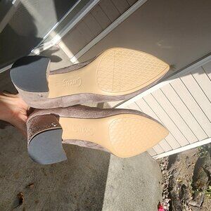 3" block heel, Pointed toe, Faux suede construction, Drawstring topline, Inner side-zip closure, Lightly padded leather footbed.