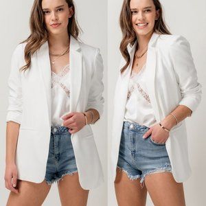 NEW Classic Collar Mid Length Side Pocket Open Front Cardigan Long Blazer Ivory