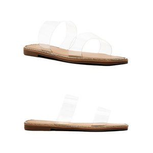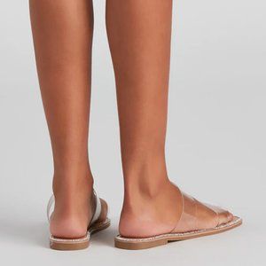 NEW in Box Brand: Qupid Color: Clear PVC/Rhinestone Embellished Run true to size TTS Being comfortable and looking glam chic is what this clear transparent rhinestone slide sandals are all about! These cute shoes are perfect to glam up any outfit with their sleek clear PVC composition that shapes an open square toe upper and a slide-on design. Sparkling silver rhinestones embellish the edges of insole for a finishing touch! Achieve simplicity and elegance in one stride with these rhinestone embellished sandals from Qupid! Wear them every day casual or to your most extravagant events – glitz is welcomed to any occasion! Clear straps are super on trend, it will elongate your legs miles long~ Heel Height approx: 0.5" Double PVC straps Rhinestone Embellished Edges Lightly cushioned footbed Slip on, slides design All manmade materials.