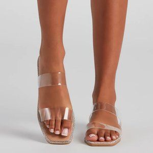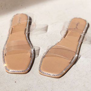 NEW Clear Sparkly Rhinestone Embellished Double Straps Slip On Slides Sandals