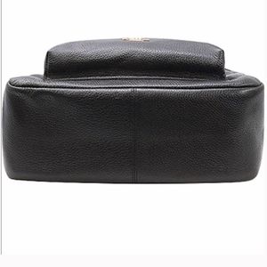 New with tags! One size. Black pebbled leather with gold colored hardware. Inside zip and multifunction pockets. Adjustable shoulder straps. No trades!