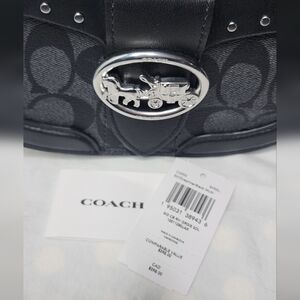 Elevate your style with this stunning Coach Georgie women's saddle bag. Crafted from top-quality leather and signature canvas, this bag features a magnetic closure and a black crossbody strap for easy and comfortable wear. The bag is adorned with strap accents and gold hardware, adding a touch of elegance to your outfit. Designed for travel, casual outings, and business meetings, this small-sized bag is perfect for holding your essentials. The lined interior features inner pockets, allowing you to keep your belongings organized. The bag also comes with a detachable and adjustable strap, a bag charm, and additional pockets for added convenience. Whether you're going out for a quick errand or a night out, this Coach Georgie saddle bag is the perfect accessory to complement your outfit.