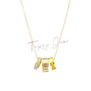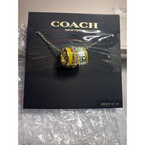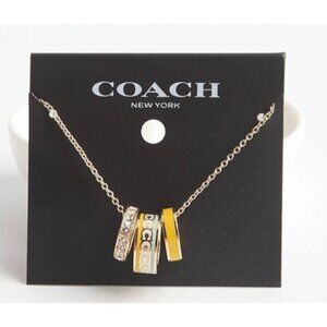 This Coach necklace showcases elegance with its gold-tone multi-ring pendant, featuring signature logos, vibrant enamel, and sparkling crystal accents. A chic accessory for adding finesse to formal or casual looks.