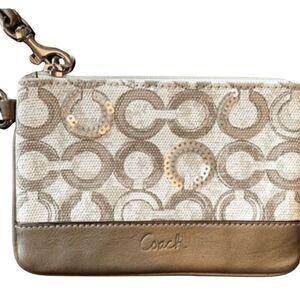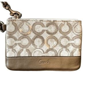 NEW Coach Kristen OP ART Sequin Wristlet #45096 Signature Canvas Chanel style C in taupe and off white (mushroom) with bronze leather and sequin details hangtag with Coach logo hardware. C's are a beautiful soft mushroomy bronze. A few C's have a little bling to them with luminescent sequins added. Sequins sparkle more than captured in the photos. Interior salmon sateen lining.