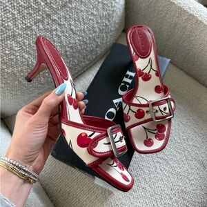 Authentic, brand new in box Coach Margot cherry print leather sandals with front buckle