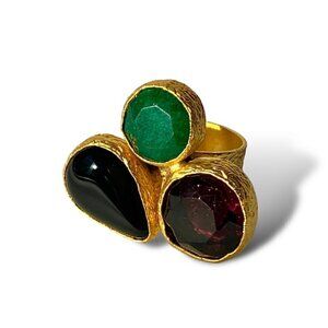 NEW Cocktail Ring 24K Gold Plated Onyx Amethyst Emerald Gem Cluster Adjustable