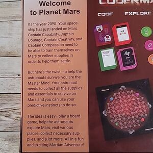 Easy to get started, focuses on concepts. CODE EXPLORE SETTLE- Get your resources first, explore Mars Terrain. Reach the destination before the others do, beware of volcanoes at Mars! Play with basic or advance card.