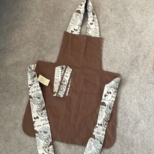 Coffee Apron. Reversible brown, black and cream. With coffee word print fabric. Cute coffee cup pockets on both sides. New with a tag. Purchased at one of those cute little shops Suttons Bay. Body is 22” X 28”. Soft Canvas feel fabric