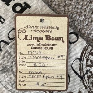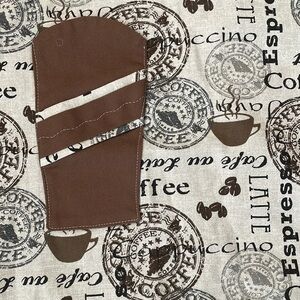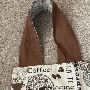 Coffee Apron. Reversible brown, black and cream. With coffee word print fabric. Cute coffee cup pockets on both sides. New with a tag. Purchased at one of those cute little shops Suttons Bay. Body is 22” X 28”. Soft Canvas feel fabric