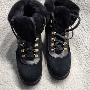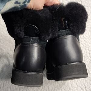 Leather, wool upper; polyester faux-fur cuff; polyester lining; manmade, rubber sole